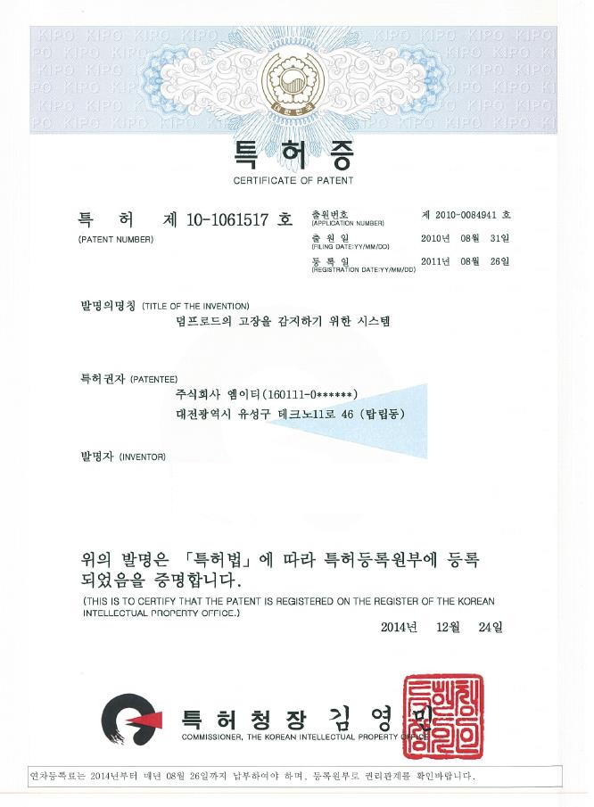 특허등록(덤프로드의 고장을 감지하기 위한 시스템) M.E.T 2015-01-02 00:00:00 view : 5235 목록 이전글유성구노인복지관 후원물품 기부2015.02.09 다음글특허등록(서보 드라이버 검사 장치)2014.10.08