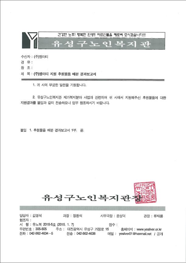 유성구노인복지관 후원물품 기부 M.E.T 2015-02-09 10:03:58 view : 5289 목록 이전글(주)엠이티 - 국군통신사령부 업무협약2015.04.15 다음글특허등록(덤프로드의 고장을 감지하기 위한 시스템)2015.01.02
