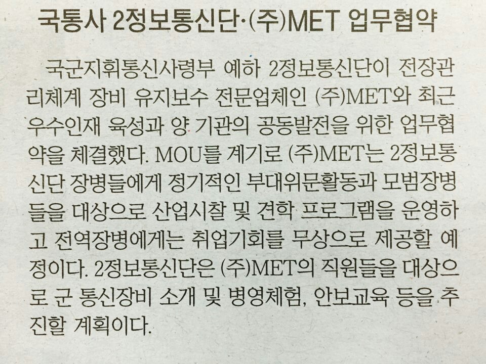 (주)엠이티 - 국군통신사령부 업무협약 M.E.T 2015-04-15 00:00:00 view : 5307 국방일보 기사 게재 기사바로가기 목록 이전글사옥이전 1주년 파티2015.07.13 다음글유성구노인복지관 후원물품 기부2015.02.09