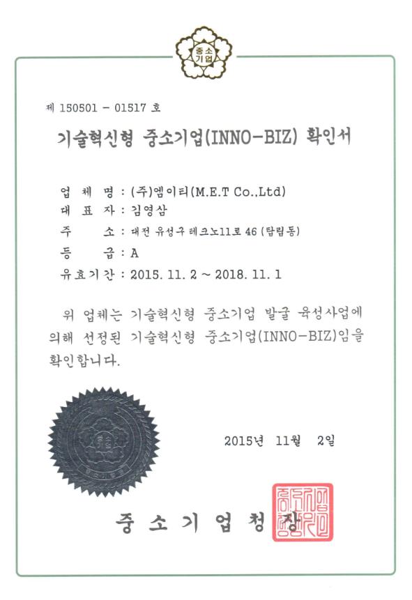 저희 (주)엠이티가 우수한 연구 개발 인력, 수준 높은 컨텐츠 개발 역량, 마케팅, 경영혁신평가 등에서 골고루 높은 평가를 받아 기술혁신형 중소기업(INNO-BIZ)인증을 획득하였습니다.