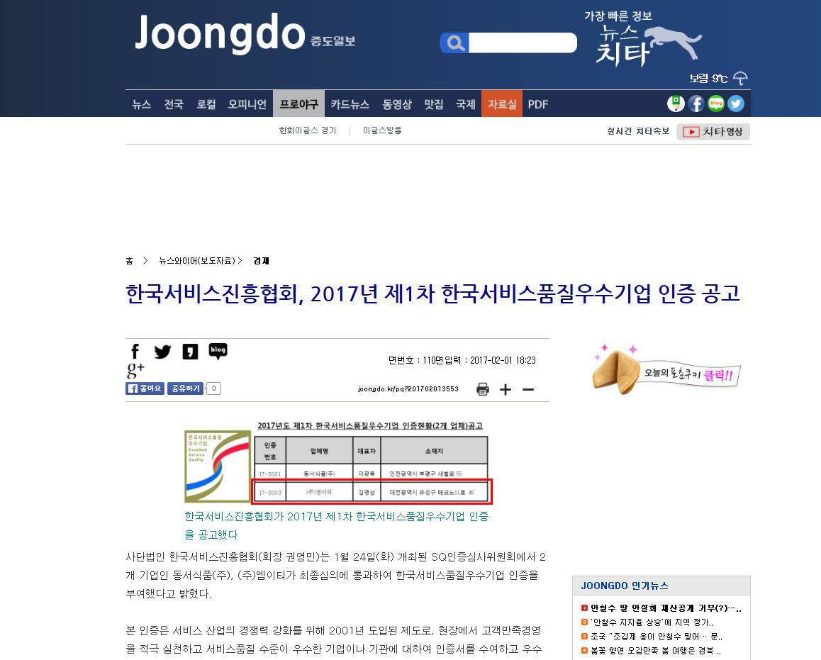 중도일보 한국서비스품질(SQ)우수기업 인증 공고 기사 M.E.T 2017-04-11 11:31:20 view : 4478 저희가 2월 1일에 한국서비스품질(SQ)우수기업 인증을 받았잖아요? 중도일보에 저희가 인증받았다고 공고가 올라왔었는데 소식을 전해드리지 않았던것 같아서 뒤늦게라도 다시 한번 소식 전달해 드리려고요 ~ 현재 저희는 전 직원들이 CS교육을 받을 예정에 있고요 서비스 품질을 높이려고 많은 노력을 하고 있습니다 ^^ 기대해주세요 ~ 기사바로가기 목록 이전글(주)엠이티에 권선택 대전시장님 방문하다2017.04.13 다음글제11회 대한민국 서비스만족 대상 수상2017.04.04