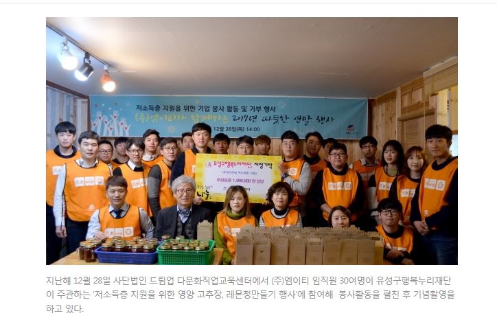 (주)엠이티 저소득층 지원 따뜻한 연말 행사 한국스포츠경제 기사보도