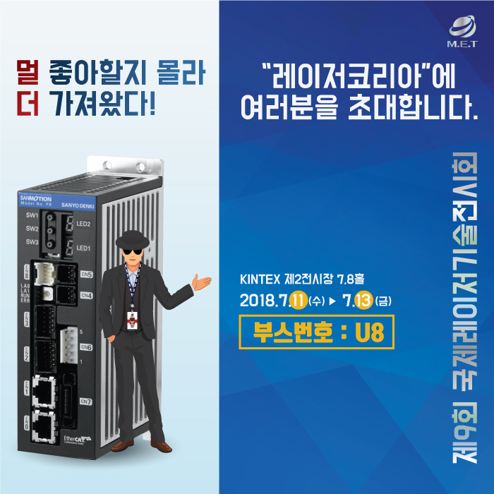 "레이저코리아"에 여러분을 초대합니다. M.E.T 2018-07-06 15:37:12 view : 4691 행사명 : LASER KOREA 2018 기 간 : 2018. 7. 11(수) ~ 13(금) / 3일간 장 소 : 킨텍스 제2전시장 7, 8홀 자세한 내용은 블로그를 확인해주세요 ~ 블로그 바로가기 목록 이전글2018년 추석명절 휴무안내 및 배송안내입니다.2018.09.17 다음글(주)엠이티, 기술전문기업 지정에 이어 '경영혁신형 중소기업(Main-Biz)' 선정2018.05.10