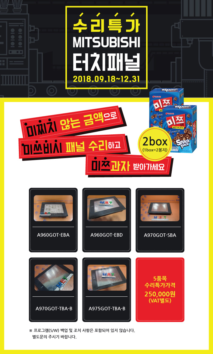 수리특가 !! 미쓰비시 패널 수리하고 미쯔과자 받아가세요 M.E.T 2018-09-17 00:00:00 view : 5294 목록 이전글※ [필독] CJ 대한통운 택배사 이용 안내2018.11.13 다음글2018년 추석명절 휴무안내 및 배송안내입니다.2018.09.17