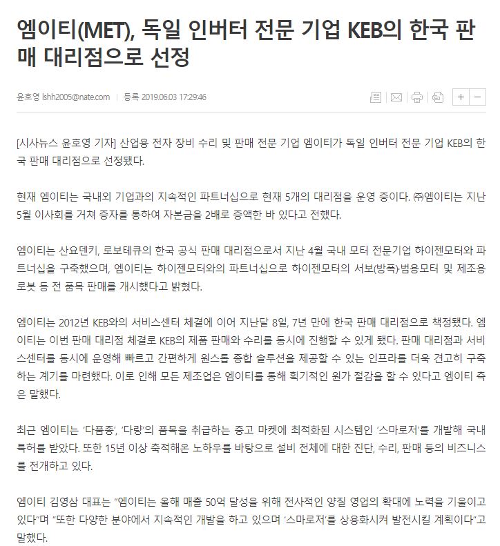 엠이티, 지난 6월 독일 인버터 전문기업 KEB의 한국 판매 대리점 계약 M.E.T 2019-08-13 00:00:00 view : 3698 기사 바로 가기 목록 이전글월간 내일 8월호, 투명경영을 근간으로 나아갈 (주)엠이티의 미래2019.08.13 다음글저희 교육실을 영상으로 만나보세요~!!2019.06.12