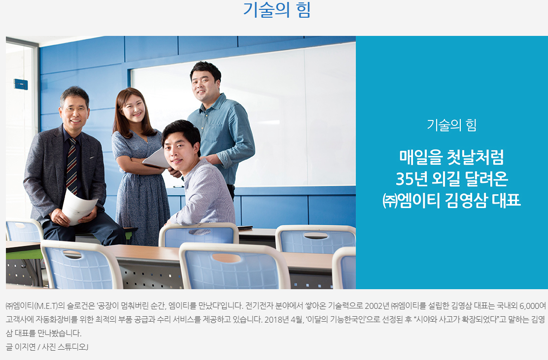 월간 내일 8월호, 투명경영을 근간으로 나아갈 (주)엠이티의 미래 M.E.T 2019-08-13 15:17:11 view : 4454 기사 바로 가기 목록 이전글[M.E.T 공지사항] 엠이티 수리의뢰서 양식2019.09.18 다음글엠이티, 지난 6월 독일 인버터 전문기업 KEB의 한국 판매 대리점 계약2019.08.13